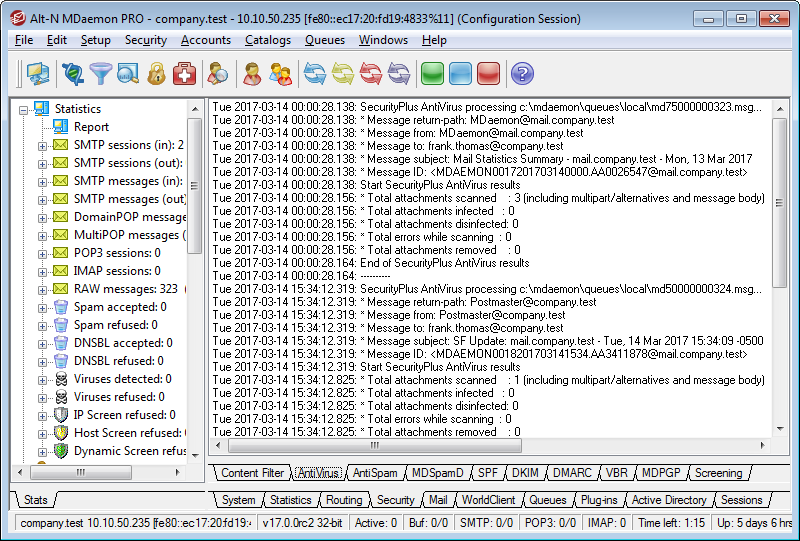 The Statistics section contains statistics regarding the number of messages sent and received by MDaemon as well as statistics for POP and IMAP sessions, Spam accepted and refused, viruses, and more. These stats are counted from the time MDaemon starts, and there is a right-click shortcut menu that can be used to clear the counters.