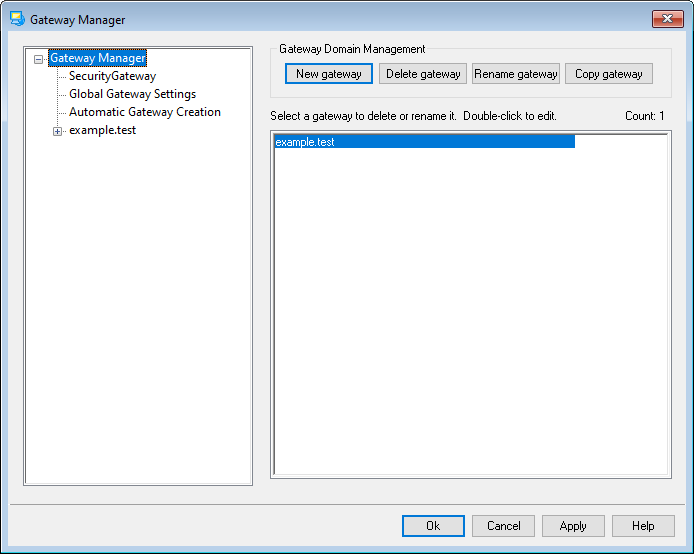 To create a new gateway: click New gateway, enter the gateway name (e.g. example.mail) in the Create/Rename Gateway Domain dialog, and click OK.