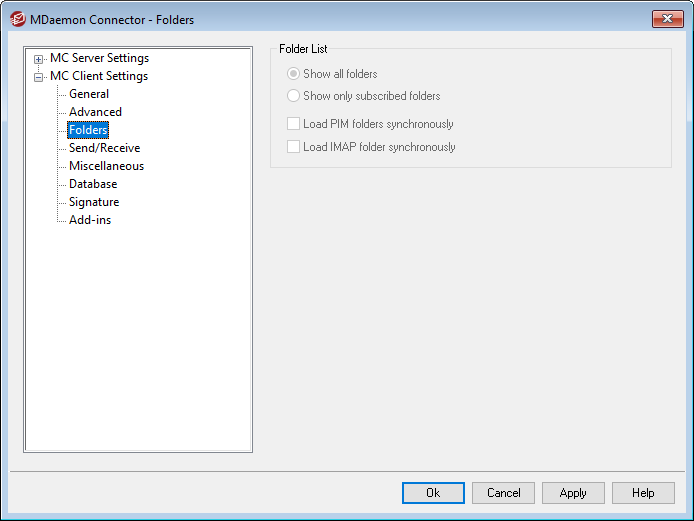 When you have enabled the "Push client settings to MC users" option on the MC Client Settings screen, the settings on this screen will be pushed to the corresponding screen in the MDaemon Connector client whenever an MDaemon Connector user connects to the server. The MC Client Settings are only sent to clients when one of the settings has changed since the last time the client connected and received them.