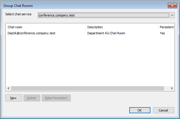 Click this button to open the Group Chat Rooms dialog. Ordinarily, when a user creates a chat room it will disappear when the last person leaves the room, but you can use these options to create persistent chat rooms that will remain when empty. You can also delete rooms and convert existing, temporary rooms to persistent ones.