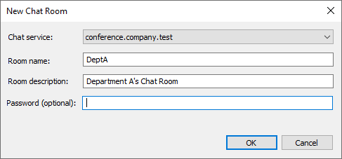 For multi-user/group chat service, clients typically display this as "rooms" or "conferences." When you want to start a group chat session, create a room/conference (giving it a name) and then invite the other users to that room. Most clients don't require you to enter a server location for the conference; you only need to enter a name for it. When you are required to do so, however, use "conference.<your domain>" as the location (e.g. conference.example.com). A few clients require you to enter the name and location together in the form: "room@conference.<your domain>" (e.g. Room01@conference.example.com).