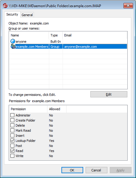 Access rights are controlled through MDaemon's support for Access Control Lists (ACL). ACL is an extension to the Internet Message Access Protocol (IMAP4), which makes it possible for you to create an access list for each of your IMAP message folders, thus granting folder access rights to other users who also have accounts on your mail server. If your email client doesn't support ACL you can still set the permissions via the controls on this dialog.