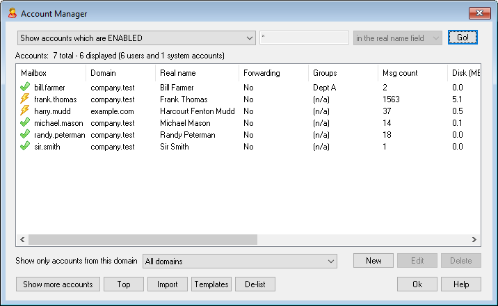 To better manage the selection, addition, deletion, or modification of your accounts, MDaemon contains the Account Manager. This dialog provides access to account information and can be used to sort accounts by mailbox, domain, real name, or mail folder. The Account Manager is located under the Accounts menu at: Accounts » Account Manager...
