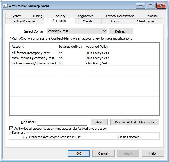 Use this screen to designate the accounts that are authorized to use ActiveSync. You can manually authorize or revoke accounts, or set MDaemon to authorize them automatically one at a time as each account connects using ActiveSync.