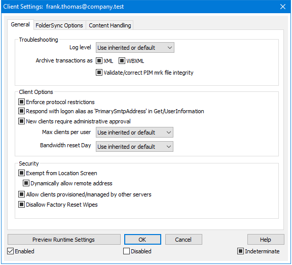 Right-click an account and click Customize Client Settings to manage the Client Settings for the account. These settings will be applied to any ActiveSync clients that connect for the account.