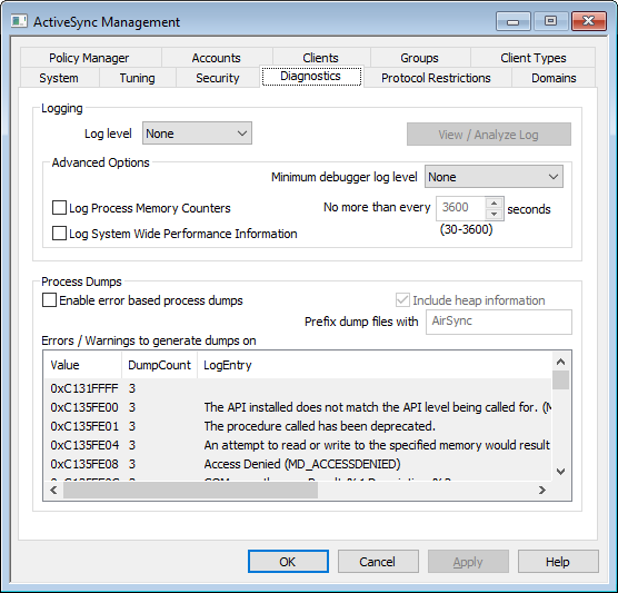 This section contains ActiveSync's global Log Level setting. Domain Client Settings with the Log Level set to "Use inherited or default," will inherit that setting from here.