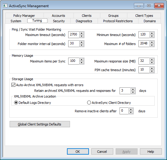 This screen contains advanced options, which in most cases will not need to be adjusted, and it contains a button to open the Global Client Settings Defaults dialog, to adjust the default settings used for ActiveSync clients.
