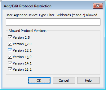 Use the options located under "ActiveSync » Protocol Restrictions" to tell certain clients and devices that they are restricted to specific ActiveSync protocols. This is useful when, for example, a certain type of device is found to have unreliable support for one protocol but reliable support for another. Using the Add/Edit Protocol Restriction dialog, you can define restrictions based on User Agent or Device Type, and restrict the devices to any of the following ActiveSync protocol versions: 2.5, 12.0, 12.1, 14.0, 14.1, and 16.1.