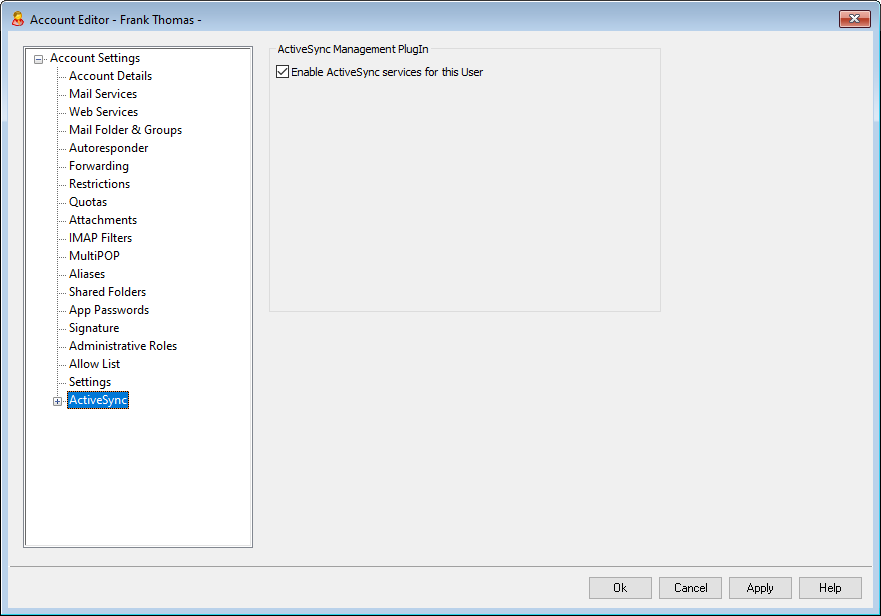 If you wish to allow the account to use an ActiveSync client to access its email and PIM data, enable this option.