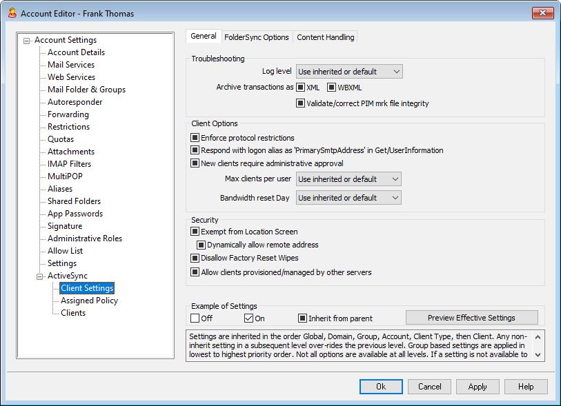 The options on this screen are used to control ActiveSync client settings for clients associated with this account. By default each of these options is configured to inherit its setting from the corresponding domain to which the account belongs. Changing any setting on this screen will override the domain setting for this account. Further, you can use the Settings option on the Clients screen if you wish to override these account-level settings for specific clients.