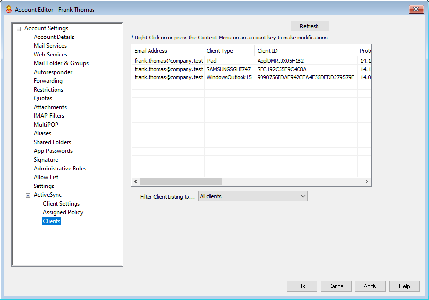 To remove an ActiveSync client, right-click the client and click Delete, and then Yes. This will remove the client from the list and delete all synchronization information related to it in MDaemon. Therefore if in the future the account uses ActiveSync to synchronize the same client, MDaemon will treat the client as if it had never before been used on the server; all client data will have to be re-synchronized with MDaemon.