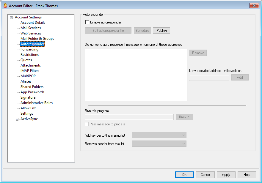 Enable this control to activate an autoresponder for the account. For more information on autoresponders see: Autoresponders.