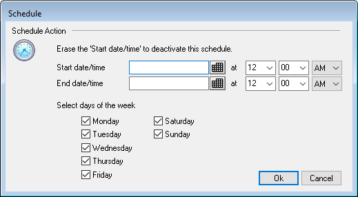Click this button to open the Schedule dialog on which you can set a start and end date and time for the Autoresponder, and set the days of the week for it to be active. Leave the Schedule blank if you want the Autoresponder to be active continually.