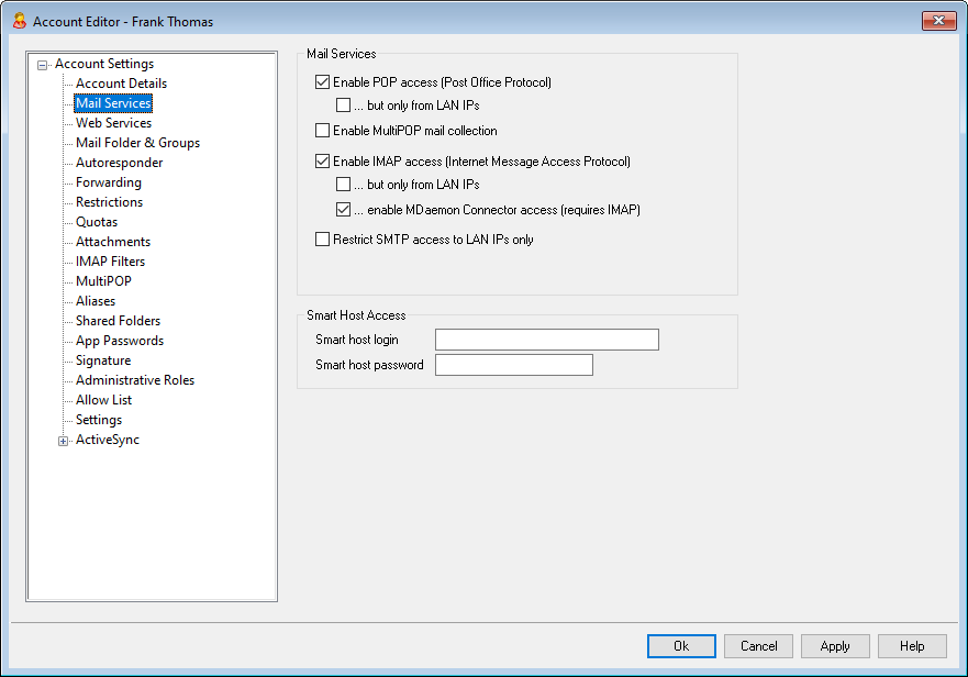 The options on this screen govern which mail services the account is allowed to use: POP, IMAP, MultiPOP, and MDaemon Connector. Email access via Webmail is controlled from the Web Services screen. It also contains options for specifying optional Smart Host Access credentials for the account.