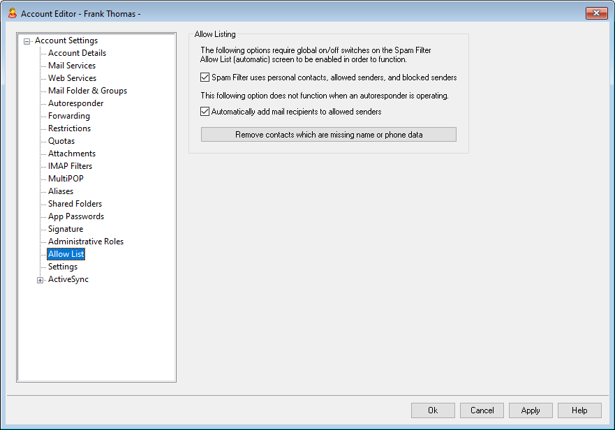 The Spam Filter's Allow List (automatic) screen contains a global option that can be used to cause the Spam Filter allow a message automatically when the sender of the message is found in the local recipient's personal contacts or allowed senders folder. It will also automatically block a message when the sender is found in the user's blocked senders folder. If you have enabled the Spam Filter's global option but do not wish to apply it to this account, clear this check box to override the global setting. If the global option is disabled then this option will not be available.