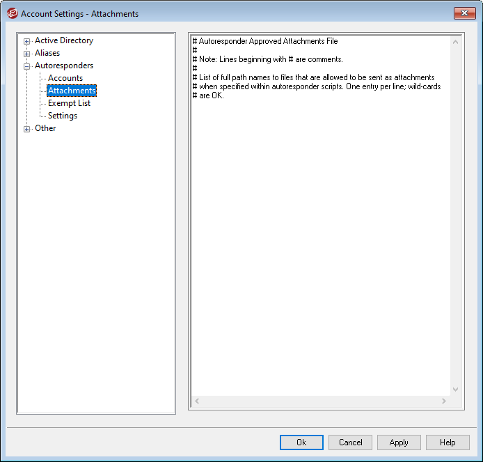 Provide the full file paths here to any files that you wish to allow to be used as attachments in autoresponder scripts. In the autoresponse script, use the %SetAttachment% replacement macro to attach the file.