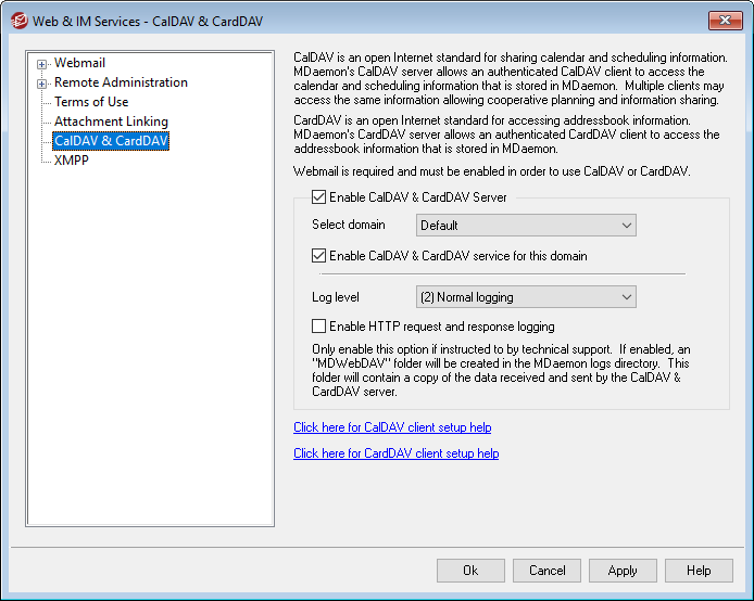 Use this drop-down list to designate the degree to which CalDAV/CardDAV activities will be logged. There are six possible levels of logging: 1-Debug logging, 2-Normal logging (default), 3-Warnings and errors only, 4-Errors only, 5-Critical errors only, and 6-No logging. This is a global setting—it cannot be applied to specific domains