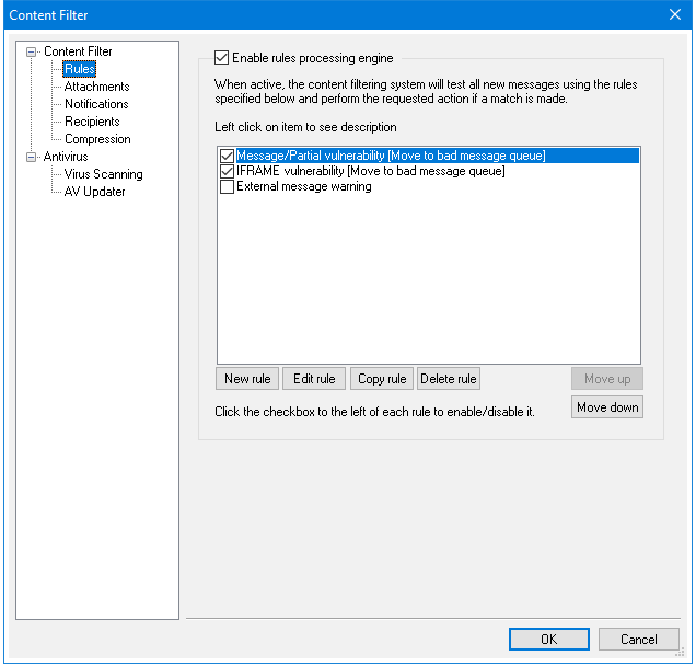 This box lists all of your Content Filter rules, with a checkbox beside each one so that you can enable/disable them at will. To see a description of any given rule in its internal script format, click that rule and pause your mouse-cursor over it (moving your mouse will cause the description to disappear). Whenever a message is processed through the Content Filter, these rules will be applied in the order in which they are listed. This makes it possible for you to arrange your rules to achieve a greater level of versatility.