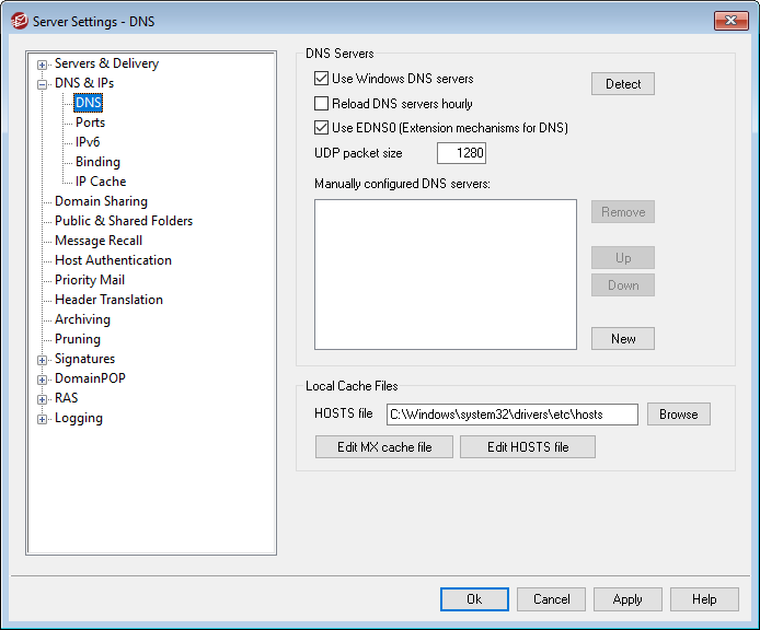 MDaemon will use all DNS servers specified here when performing DNS lookups. MDaemon will try each server once per lookup operation and in sequence until it exhausts the complete list of DNS servers or finds the first one that works. If you enable the Use Windows DNS servers option above, MDaemon will also query all DNS servers found within your Windows TCP/IP configuration. Finally, at startup the System log will display each DNS server and indicate its source (i.e. manually configured or taken from Windows).