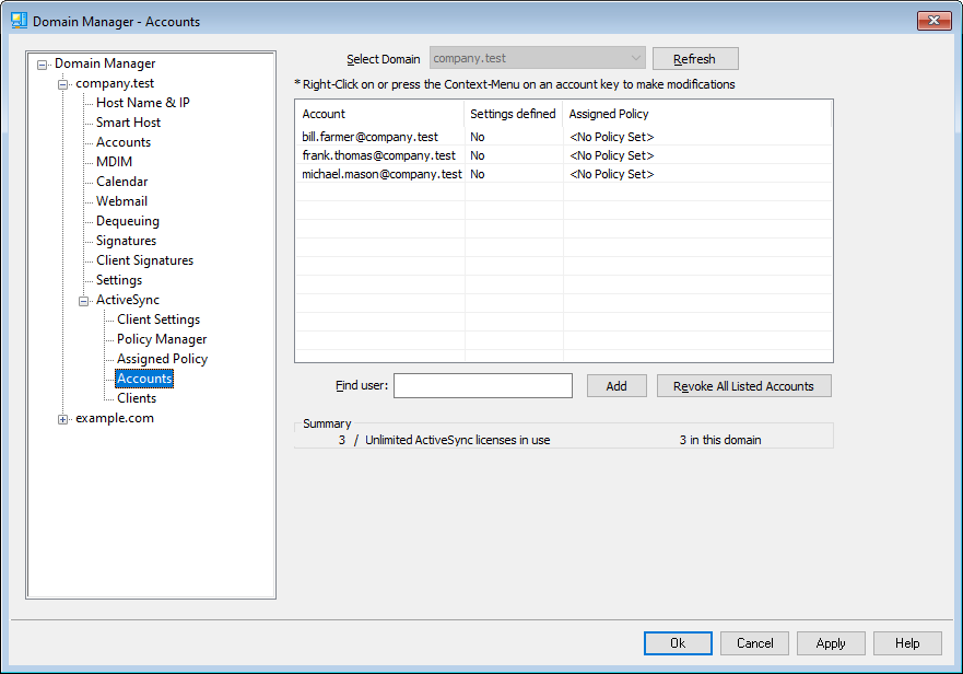 SettingsSelect an account and click Settings to manage the Client Settings for the account. These settings will be applied to any ActiveSync clients that connect for the account.