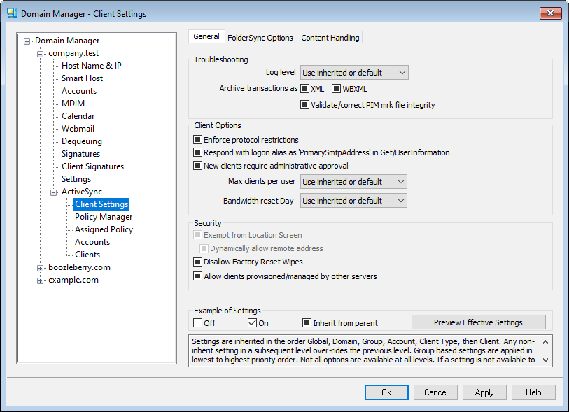 By default all of the options on this screen are set to "Use inherited or default," which means that each option will take its setting from the corresponding option on the global Client Settings screen. Similarly, this domain's accounts will inherit their settings from this screen, since it is their parent screen. Any changes made to the options on this screen will be reflected on those account screens. Below that, individual clients also have settings screens that inherit their settings from the account-level settings. This configuration makes it possible for you to make changes to all of the domain's accounts and clients simply by making changes to this one screen, while also making it possible for you to override those settings for any account or client as needed.
