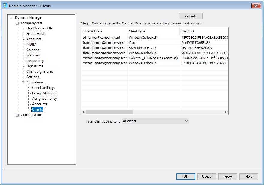 To remove an ActiveSync client, right-click the client and click Delete, and then Yes. This will remove the client from the list and delete all synchronization information related to it in MDaemon. Therefore if in the future the account uses ActiveSync to synchronize the same client, MDaemon will treat the client as if it had never before been used on the server; all client data will have to be re-synchronized with MDaemon.