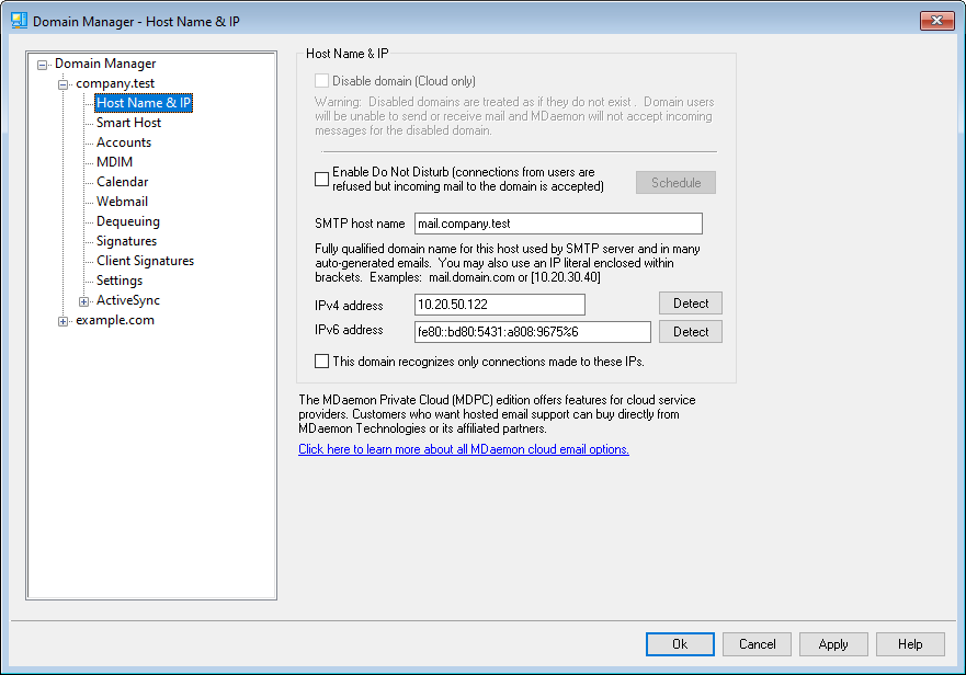 In most cases the FQDN will be either the Domain name or a subdomain of it (for example, “mail.example.com”), but an IP literal syntax such as “[192.0.2.0]” may also be used. When no FQDN value is specified, MDaemon will use the Default Domain’s FQDN.