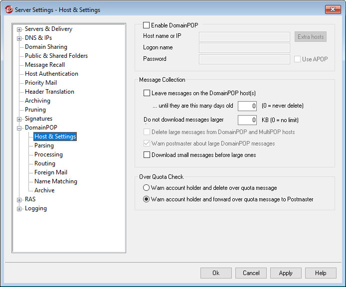 If selected, MDaemon will use the setting provided on this screen to collect mail from a DomainPOP mail host for local redistribution.