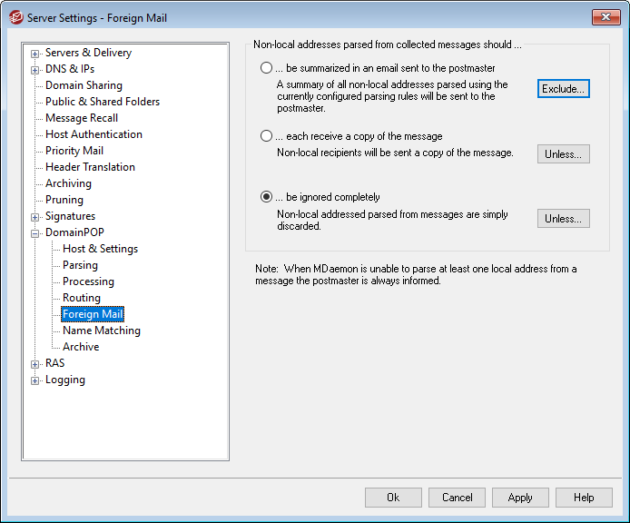 If this option is selected MDaemon will send a single copy of the message to the postmaster along with a summary of the non-local addresses that the parsing engine extracted using the current set of headers and parsing rules.
