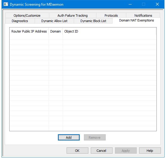 IP addresses listed here could still be blocked for other reasons, such as bots attempting to log in to non-valid accounts, misconfigured clients attempting to log in to a different MDaemon domain than the one associated with the IP address, and so on. If you wish to completely exclude an IP address from Dynamic Screening then use the Dynamic Allow List. |