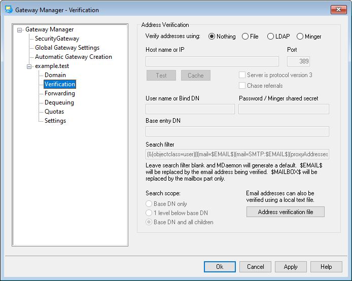 MDaemon contains a method to prevent this by verifying the recipient addresses. If the remote domain's server is configured to keep an LDAP or Active Directory server up to date with all of its mailboxes, aliases, and mailing lists, or if it runs a Minger server to provide remote address verification, then you can use the options on this screen to specify the LDAP, Active Directory, or Minger server where this information is stored. Then, when a message arrives for example.com, you can lookup the recipient's address on the other server and discover whether or not it is valid.