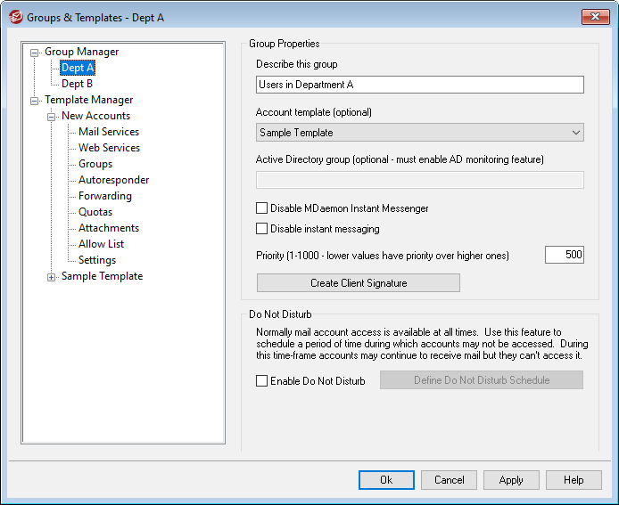 The Group Properties screen (Accounts » Groups & Templates... » [group name]) is used to configure the settings for each group you have created using the Group Manager. To open Group Properties from the Group Manager, double-click the group you wish to edit, or click the name of the group in the left pane. On this screen you can assign an Account Template to a group, allowing you to control a variety of account settings for group members. You can also link the group to an Active Directory group, control whether or not group members have access to MDaemon Instant Messenger (MDIM) and instant messaging, and set a priority level for the group. To control group membership, use the Group Manager and Mail Folder & Groups screen on the Account Editor.