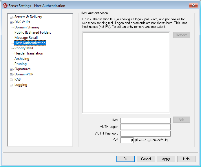 Use this screen to configure logon, password, and port values for any host. When MDaemon sends SMTP mail to that host the associated credentials found here will be used. Please note that these credentials are a fallback and are only used when other more task-specific credentials are unavailable. For example, if you configure logon and password settings for the Account Editor's forwarding options or the Gateway Manager's Dequeuing options, or any of the many other task specific settings, then those credentials are used and supersede any that are configured here. This feature works with host names only (not IP addresses).