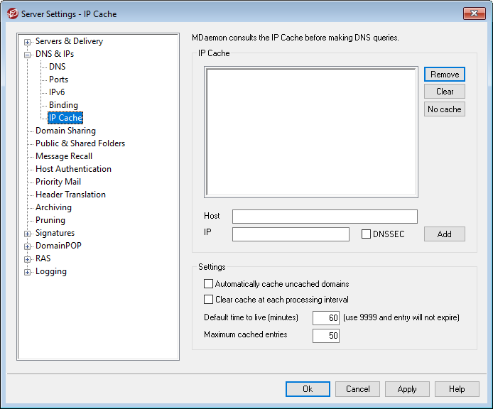 In order to speed message delivery and shorten mail processing time, MDaemon caches the IP addresses of all hosts with which it comes in contact. These IPs are stored and then the cache is checked each time MDaemon requires a DNS resolution on a host name. If the host name needing resolution is found in the IP cache then the DNS lookup is skipped, which can save a surprising amount of processing time. The settings in this window allow you to manipulate the parameters under which the cache will operate. You may also manually add and remove entries, set whether to use DNSSEC, set the maximum size of the cache, and designate how long entries will remain cached. The IP Cache can be reached from the "Setup » Server Settings » IP Cache" menu selection.