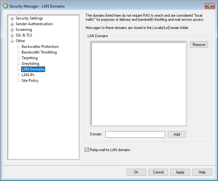 The domains listed here are considered by MDaemon to be part of your local LAN (local area network). Therefore, no dialup or Internet connection is required in order to deliver a message to one of them.