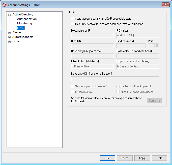 MDaemon supports Lightweight Directory Access Protocol (LDAP) functionality. Click "Accounts » Account Settings » LDAP" to reach the LDAP screen used for configuring MDaemon to keep your LDAP server up to date on all of its user accounts. MDaemon can maintain an accurate and continuously up to date LDAP database of users by communicating with your LDAP server each time an MDaemon account is added or removed. This makes it possible for users with mail clients that support LDAP to "share" a global address book that will contain entries for all of your MDaemon users as well as any other contacts that you include.