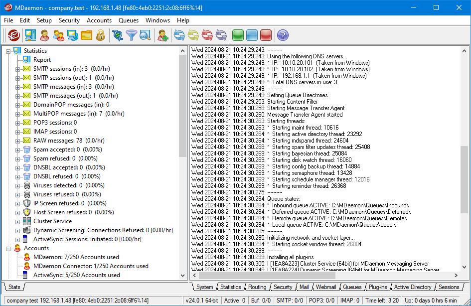 MDaemon's main graphical user interface (GUI) gives you important information regarding MDaemon's resources, statistics, active sessions, and queued mail waiting to be processed. It also contains options for easily activating/deactivating MDaemon's various servers. The GUI's tabbed panes keep you up to date on how the server and its incoming and outgoing connections are performing.