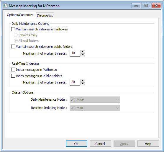 This Message Indexing page is used for the configuration of real-time and nightly maintenance of the search indexes used by Webmail, ActiveSync, and Remote Administration.