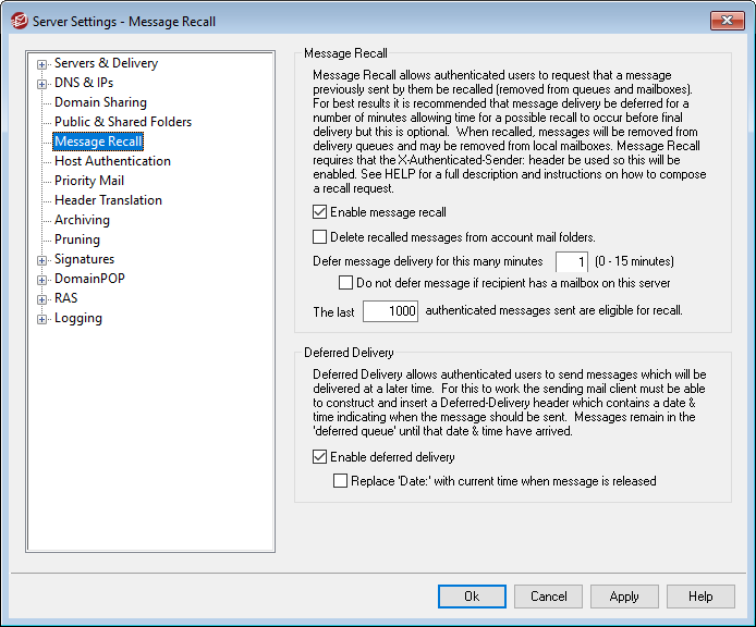 This is the number of minutes that MDaemon will hold incoming messages from authenticated local users. If a RECALL message is received during the delay period then MDaemon will delete the referenced message before any delivery attempt has been made. This option can be set to 0-15 minutes. 1 minutes is the default setting.