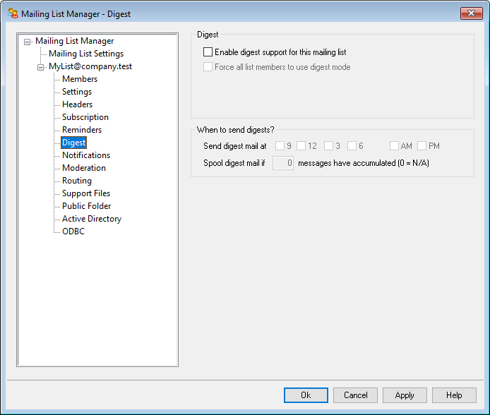 Check this box if you wish to allow digest support for this mailing list. When digest support is enabled, a copy of each message sent to the mailing list will be archived so that list members who have their membership type set to Digest will periodically be sent batches of these archived messages in a compact and indexed format rather than receive them one at a time.
