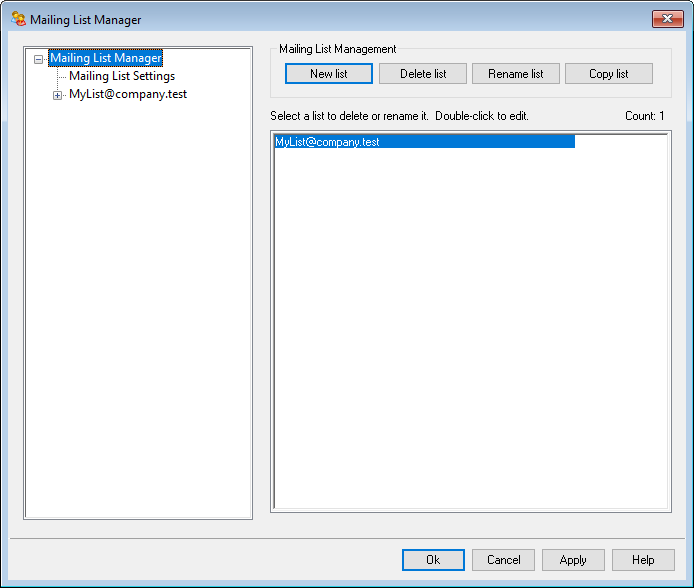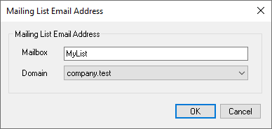 To create a new mailing list, click New list to open the Mailing List Email Address dialog. Create a mailbox name and select a domain, such as "MyList" and "example.com" respectively. This will be the mailing list's email address (i.e. MyList@example.com). Messages sent to this address will be distributed to members of the list, based on the list's particular settings. Click OK to create the list. After creating the list you can double-click its entry to configure its settings and add members. Note: List names cannot contain " ! " or " | "