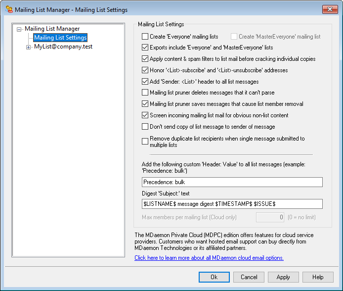 Use this option if you wish to set a maximum number of members allowed per mailing list. You can set a per domain maximum on the Domain Manager's Settings screen. This option is only available in MDaemon Private Cloud.