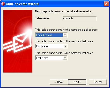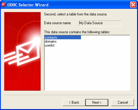 5.The data source must contain at least one table with fields for email addresses and names. If the data source contains one or more qualifying tables, choose the desired table and click Next. Otherwise, click Cancel to exit the ODBC Selector Wizard and then use your database application to add a table to the relevant database before continuing.