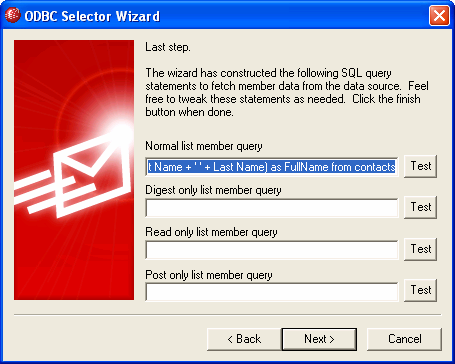 7.The ODBC Selector Wizard will construct an SQL query statement based on your selections in Step 6. MDaemon will use it to retrieve normal list member data from your database. You can edit this statement as desired, and include other query statements in the remaining controls to cause members to receive messages in Digest mode, and to designate members as Read Only or Post Only. A Test button is provided beside each control so that you can test your query statements to make sure they retrieve the proper data. When you are finished configuring your query statements, click Next.