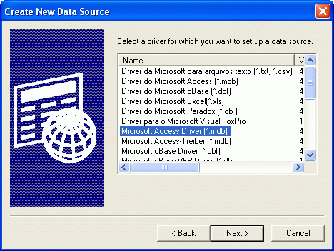 | 5. | Select the database driver for which you wish to set up the data source, and click Next. |