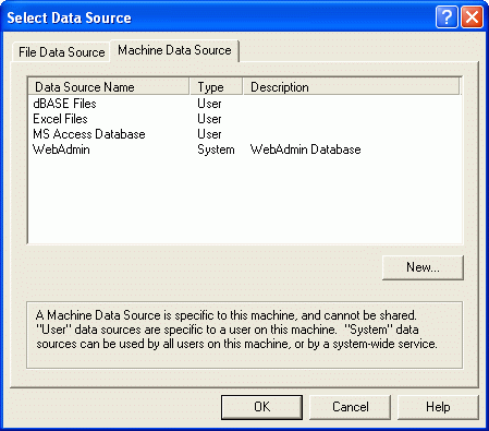 | 3. | Switch to the Machine Data Source tab, and click New... to open the Create New Data Source dialog. |