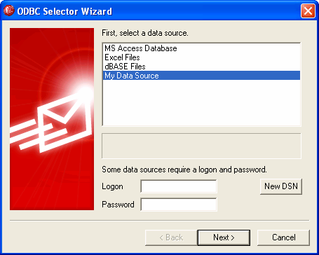 | 1. | On the ODBC screen of the Mailing List editor, click Connect to new ODBC source to open the ODBC Selector Wizard. |