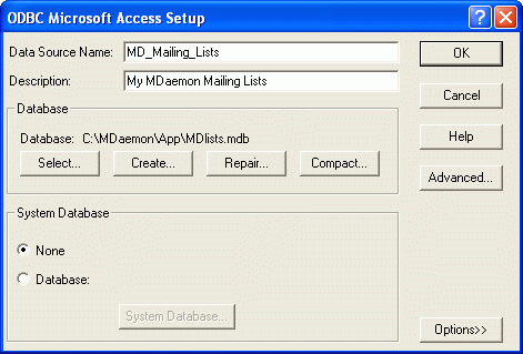 | 6. | Click Finish to display the driver-specific setup dialog. The appearance of this dialog will vary based on which driver you have selected (Microsoft Access Setup dialog shown below). |