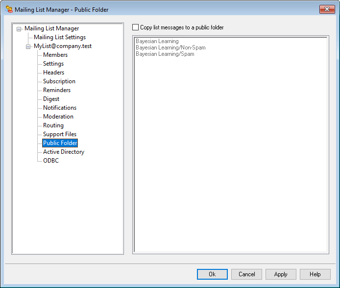 MDaemon supports using Public IMAP Folders with mailing lists. Unlike personal IMAP folders, which are typically only accessible by a single user, Public folders are extra folders that are available to multiple IMAP users. The options on this screen are used to cause all messages destined for the Mailing List to be automatically copied to one of your public folders.