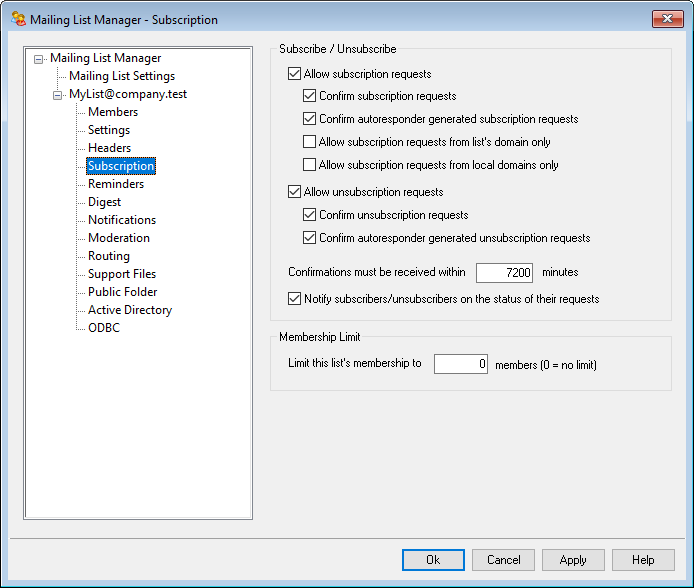 This is the number of minutes that the recipient of a subscription or unsubscription confirmation message has before the message will expire. If this time limit is exceeded before MDaemon receives a reply to the message, then the address will not be added or removed from the list. The address would then need to submit a new request to join or leave the list. The default setting of this option is 7200 minutes (i.e. five days).